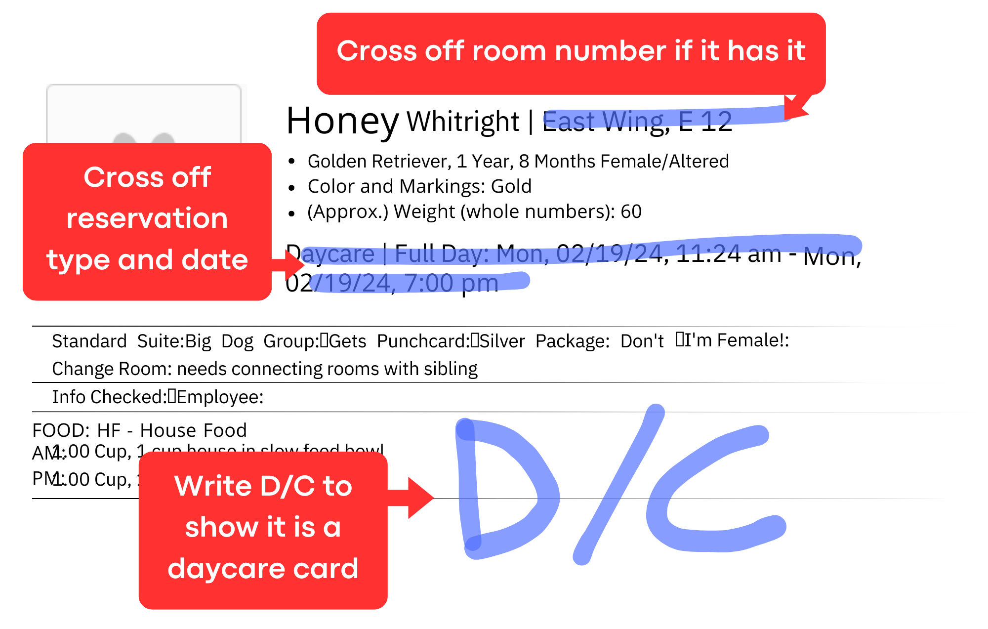 - Mark up the run card - cross off room number if it has it, cross off reservation type and date, and write 'D/C' to show it is a daycare card. Then put the card in a plastic sleeve and file away.