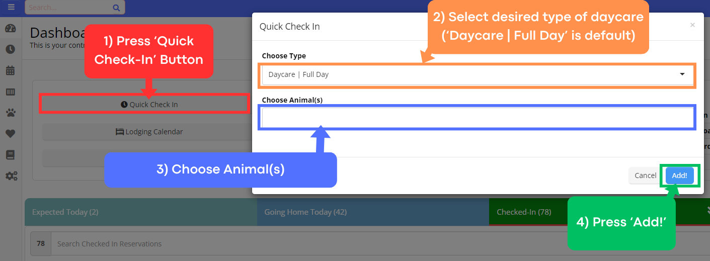 - This is a fast way to check in a daycare guest if they come in without a reservation. Please notify the customer of this so we can reserve a spot for them in the future (reservations are required for all types of services!).